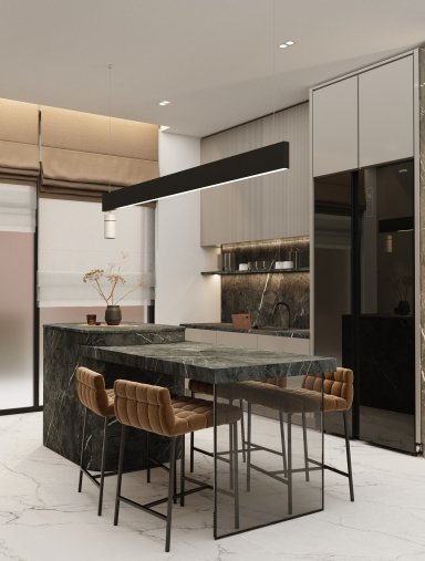 This kitchen exudes luxury with bold terrazzo countertops, deep green tiles, and warm walnut cabinetry. Accented with gold fixtures and lush greenery, it creates a perfect harmony of elegance and modern design.